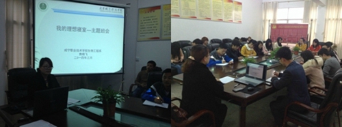 3月20日,生物工程系焦晓飞老师组织班级召开了题为《我的宿舍 我的家》主题班会,班会通过新生对我的宿舍—我的家的憧憬、在校生对我的宿舍—我的家的感悟、毕业生对我的宿舍—我的家的怀念来唤醒同学们对“家”的认识,对“家”的期盼,对建设文明和谐的“家”的自觉。在班会上,同学们积极为构建宿舍和谐人际关系,创建文明和谐宿舍建言献策,决心落实行动,身体力行,发扬热情似火、勤俭节约、热爱劳动、乐于助人、无私奉献的雷锋精神,热爱自己的宿舍,建好自己的家。